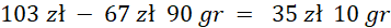 W sumie klient dał ekspedientce 103 zł, za zakupy powinien zapłacić 67 zł 90 gr, więc, żeby obliczyć resztę, musimy od kwoty, którą dał odjąć kwotę za zakupy.