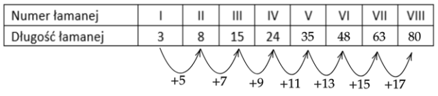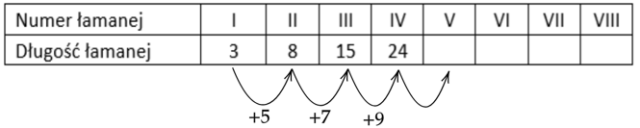 Więc do łamanej długości V należy dodać 13, aby otrzymać długość VI, następnie do łamanej numer VI trzeba dodać 15, a do łamanej numer VII dodać 17.