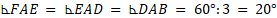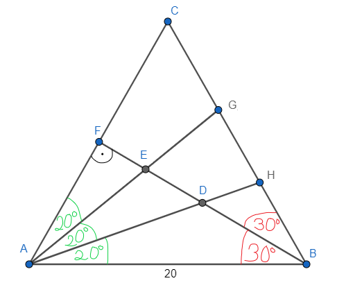W trójkącie równobocznym ABC o boku długości 20 poprowadzono dwie półproste z wierzchołka A, które podzieliły kąt BAC na trzy kąty o takich samych miarach. Następnie z wierzchołka B poprowadzono dwusieczną, która przecięła te półproste w punktach D i E, przy czym długość odcinka |BD| jest mniejsza niż długość odcinka |BE|. Należy rozwiązać trójkąt ADE.