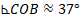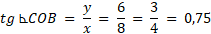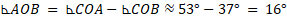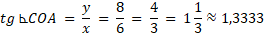 Zacznij od zaznaczenia kąta C na osi x. Kolejno policz tangensa kąta ⊾COB i następnie wyznacz przybliżoną wartość tego kąta. Postąp podobnie dla kąta COA. Na koniec oblicz przybliżoną miarę kąta AOB.