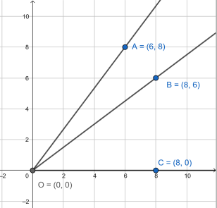 Dla punktów O(0, 0), A(6, 8), B(8, 6) wyznacz miarę kąta AOB. Odpowiedź podaj z dokładnością do