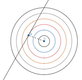 Narysowano 6 okręgów o wspólnym środku w punkcie O i promieniach odpowiednio 1 cm, 2 cm, 3 cm, 4 cm, 5 cm i 6 cm. Następnie poprowadzono styczną do jednego z tych okręgów, która jednocześnie jest sieczną dla trzech innych okręgów. Oblicz odległość punktu O od tej prostej.