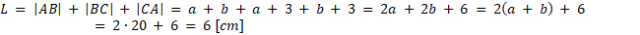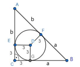 Przyjmij oznaczenia jak na rysunku. Czworokąt EDGC jest kwadratem, którego wszystkie boki są równe długości promienia, czyli 3. Skorzystaj z twierdzenia o odcinkach stycznych i stwierdź, że |EA| = |AF| = b i |FB| = |GB| = a. Bok AB ma długość 20 cm, więc a + b = 20 cm. Następnie oblicz obwód trójkąta. Za wyrażenie (a + b) podstaw wartość 20 cm.