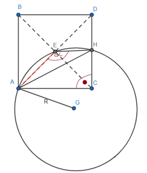 , ponieważ przekątne przecinają się pod kątem prostym. Punk H dzieli bok DC na pół, czyli |DH| = |HC| = 2. Oblicz długość |AH| z twierdzenia Pitagorasa w trójkącie HCA. Na koniec skorzystaj z twierdzenia sinusów w trójkącie EHA, aby znaleźć długość R promienia.