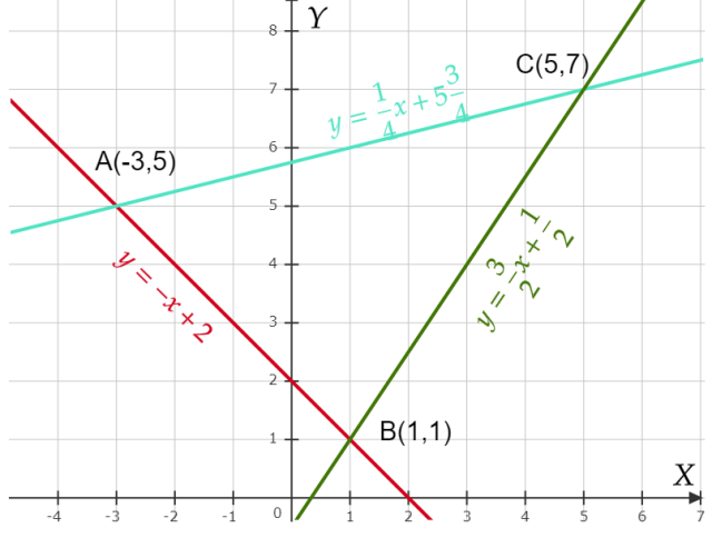 Współrzędne wierzchołków tego trójkąta, to będą punkty przecięcia podanych prostych. Naszkicuj je wszystkie w jednym układzie współrzędnych. Przekształć każdą prosta do postaci kierunkowej, a następnie stwórz tabelki ze współrzędnymi dwóch punktów z każdej prostej. Wybierz w tym celu dwa dowolne argumenty i ze wzoru prostej wyznacz odpowiadające im wartości. Zaznacz te dwa punkty w układzie współrzędnych, a następnie stwórz prostą przechodzącą przez nie.