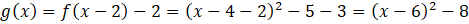 Najmniejsza wartość zmniejszyła się o 3, czyli wykres przesunięto o 3 jednostki w dół. Dodatkowo, oś symetrii przesunęła się o 2 jednostki w prawo, czyli wykres przesunięto również o 2 jednostki w prawo.