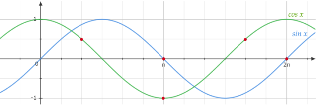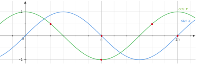 Narysuj wykresy funkcji sinus i cosinus, zaznacz na nim wartości dla których