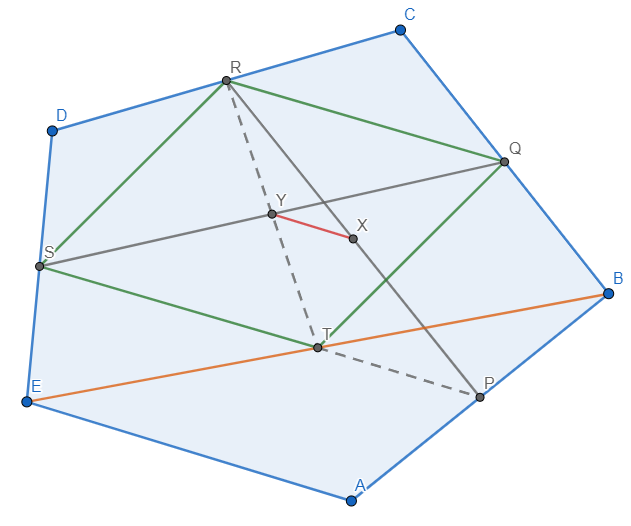 W tym zadaniu musisz wykazać, iż odcinek łączący środki odcinków, które łączą środki przeciwległych boków pięciokąta wypukłego, jest równoległy do pozostałego boku i czterokrotnie od niego krótszy.