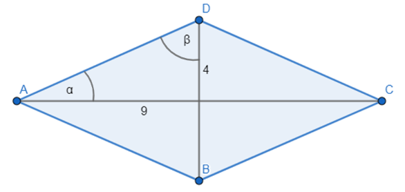 W tym zadaniu musisz obliczyć miary kątów rombu o przekątnych: 9 oraz 4.