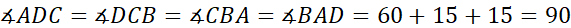 Powstały 4 trójkąty rozwartokątne o dwóch ramionach równych bokom kwadratu, w których kąty rozwarte wynoszą: 360 – 60 – 60 – 90 = 150. Są to trójkąty równoramienne, więc ich kąty przy podstawach będą wynosić: (180 - 150) : 2 = 15.