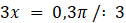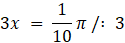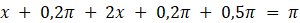 Niech miara kąta CAD będzie oznaczona jako x. Wtedy kąt EAB ma miarę (x + 0,1π) rad oraz miary kątów CAB i ABC wynoszą (2x + 0,2π) rad. Trójkąt ABD jest prostokątny z kątami o miarach: x + 0,2π, 2x + 0,2π, 0,5π. Można zapisać równanie: