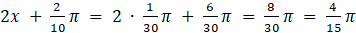 Zatem kąty CAB oraz ABC przy podstawie trójkąta mają miary: 2x + 0,2π = 2 ∙ 0,1π + 0,2π = 0,4π; kąt ACB między ramionami trójkąta ma miarę: π – 2 ∙ 0,4π = 0,2π.