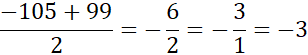 Zsumujmy dwa skrajne składniki działania −105 + 99 = −6. Zauważmy, że ten sam wynik dostajemy, sumując kolejne dwa składniki −104 + 98 = −6, analogicznie −103 + 97 = −6 itd. Tak będziemy zbliżać się do „środka” działania, który wynosi tyle, ile średnia arytmetyczna wyrazów skrajnych. Obliczmy więc, jaka liczba występuje w środku działania.
