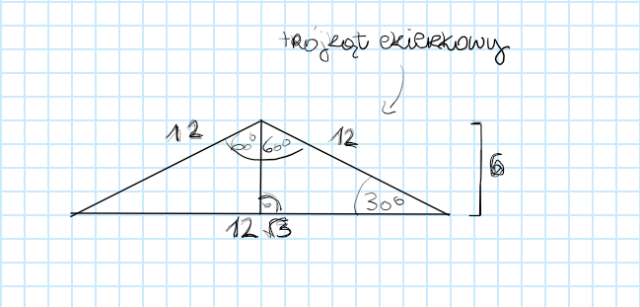 Narysuj rysunek pomocniczy podstawy bryły. Zauważ, że składa się ona z dwóch przystających trójkątów 30-60-90. Oblicz z równania Pitagorasa nieznane długości krawędzi i zastosuj wzór na objętość i pole całkowite bryły. Pamiętaj, że objętość ostrosłupa to jedna trzecia iloczynu pola podstawy i wysokości.