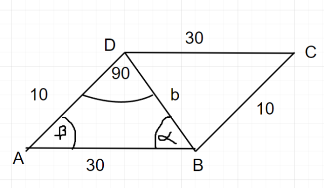 W tym zadaniu musisz obliczyć miary kątów tego równoległoboku jeśli w równoległoboku o bokach długości 10 cm i 30 cm krótsza przekątna tworzy z jednym bokiem kąt