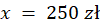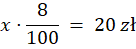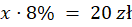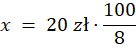 Kwota, jaką Bolek miał na początku (szukana x) pomnożona razy stopa oprocentowania (8%) jest równa kwocie uzyskanych odsetek, czyli 20 zł. Zapisz odpowiednie równanie i rozwiąż je względem x.