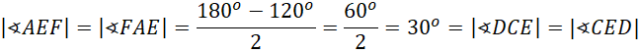 Następnie zauważ, że trójkąty AFD i CDE są równoramienne, więc miara ich kątów przy podstawach będzie taka sama. Dodatkowo skorzystaj z tego, że suma miar kątów w trójkącie wynosi