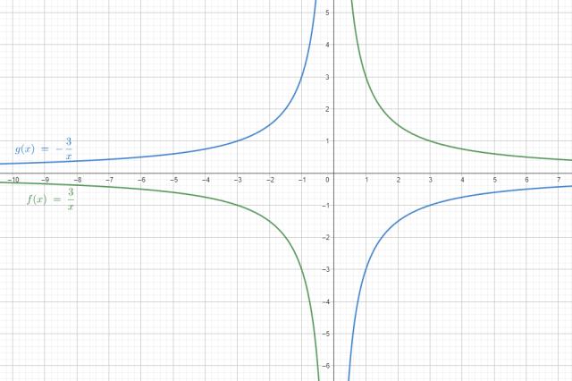 Przekształcenie wykresu funkcji względem osi x oznacza, że nowoutworzona funkcja jest lustrzanym odbiciem pierwotnej, względem osi x. Jej dziedzina się nie zmienia, a elementy zbiory wartości zmieniają znak na przeciwny.
