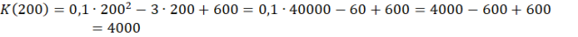 Żeby obliczyć koszt produkcji 200 sztuk, oblicz jaką wartość przyjmuje funkcja dla argumentu 200: