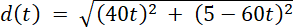 samochód podróżujący na wschód ze stałą prędkością 40 km/h mija punkt P, a samochód podróżujący na południe ze stałą prędkością 60 km/h znajduje się dokładnie 5 km na północ od punktu P. W tym zadaniu musisz wyznaczyć wzór funkcji y = d(t), opisujący odległość [km] między tymi samochodami w zależności od czasu t [h].