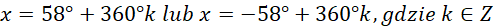 W tym zadaniu musisz znaleźć kąty, których miara jest większa od –90°, ale mniejsza od 360°, a cosinus wynosi 0,53, używając wzorów redukcyjnych.
