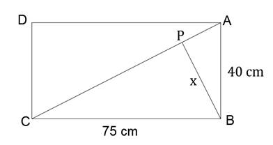 Dany jest prostokąt ABCD. Jego boki są długości |AB| = 40 cm i |BC| = 75 cm. Wskaż odległość przekątnej AC od wierzchołka B