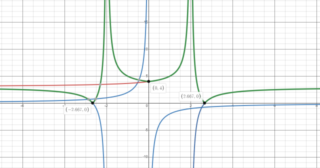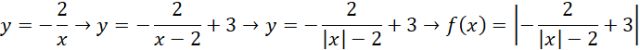 Najpierw przekształcamy wzór w wartości bezwzględnej i rysujemy kolejnymi krokami wykres. Zaczynamy od podstawowej hiperboli, przesuwając o wektor, odbijając lustrzanie prawą stronę na lewą względem osi OY, następnie obkładając całą funkcję modułem, czyli odbijając lustrzanie część wykresu pod osią OX. Następnie znajdujemy punkt przecięcia osi OY i asymptotę poziomą, którą odczytujemy ze wzoru. Pytając się, kiedy