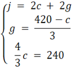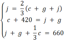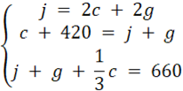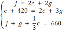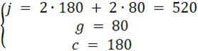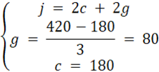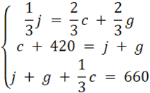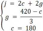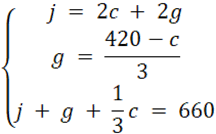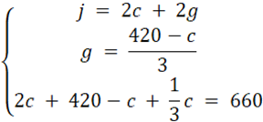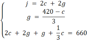 Zapisujemy warunki z treści zadania w postaci potrójnego układu równań, które następnie rozwiązujemy metodą podstawiania:
