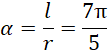 W tym zadaniu musisz powiedzieć, jaką miarę łukową ma kąt środkowy, jeśli promień okręgu ma długość 5, a łuk, na którym opiera się ten kąt, długość 7π.