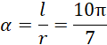 W tym zadaniu musisz powiedzieć, jaką miarę łukową ma kąt środkowy, jeśli promień okręgu ma długość 7, a łuk, na którym opiera się ten kąt, długość 10π.
