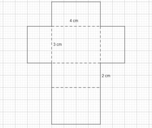 P = 2 · (2 cm · 3 cm + 3 cm · 4 cm + 2 cm · 4 cm) = 2 · (6 cm2 + 12 cm2 + 8 cm2) = 2 · 26 cm2 = 52 cm2