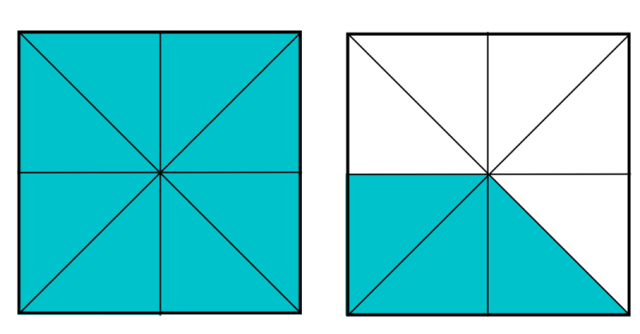 kolorem zamaluj jeden cały kwadrat i trzy części z drugiego