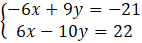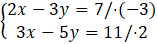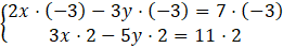 Aby uzyskać przeciwne współczynniki przy zmiennej x w obu równaniach, pierwsze równanie mnożymy obustronnie przez –3, a drugie przez 2, przez co uzyskamy współczynniki przeciwne przy x o wartości 6 i –6.