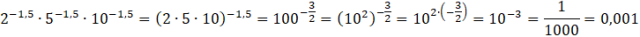 W tym zadaniu musisz wyliczyć wartość wyrażenia 2-1,5 ∙ 5-1,5 ∙ 10-1,5.