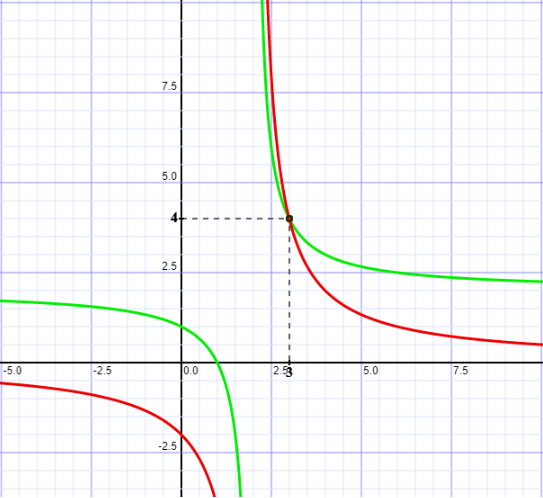 Z wykresu odczytujemy punkty przecięcia hiperbol. Odczytujemy, dla których argumentów wartości f(x) są wyżej na wykresie niż dla g(x) w celu rozwiązania nierówności.