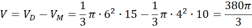 Zauważ, że wysokość i promień podstawy całego i małego stożka są względem siebie w takim samym stosunku, na tej podstawie obliczyć wysokość górnego stożka i objętość stożka ściętego, czyli różnicę dużego stożka i małego.