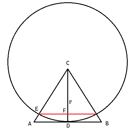 W tym zadaniu musisz obliczyć długość cięciwy powstałej wskutek przecięcia okręgu z ramionami trójkąta ABC.