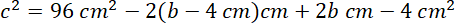 Jeżeli jeden bok wydłużysz o 2 cm, a drugi skrócisz o tyle samo, to otrzymasz kwadrat, czyli po tych zmianach boki będą mieć taką samą długość, oznacz ją jako c: