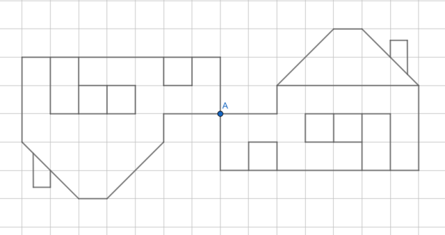 Narysuj rysunek i zaznacz punkt A. Dla każdego z punktów domku znajdź jego punkt symetryczny względem punktu A, rysując prostą przechodzącą przez te dwa punktu i zaznaczając na tej prostej punkt w takiej samej odległości od punktu A co punkt na rysunku. Na koniec połącz odpowiednie punkty tak, aby powstał obraz domku.