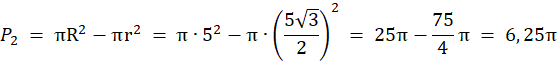 W tym zadaniu, wiedząc, że narysowane wielokąty są foremne i przystające policz, czy pole koła jest równe polu pierścienia.