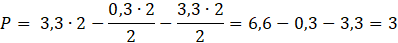 Aby obliczyć pole podanej figury, odejmiemy od pola prostokąta o wymiarach 2 x 3,3 pola dwóch trójkątów prostokątnych o przyprostokątnych długości 0,3 i 2 oraz 3,3 i 2: