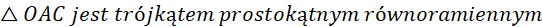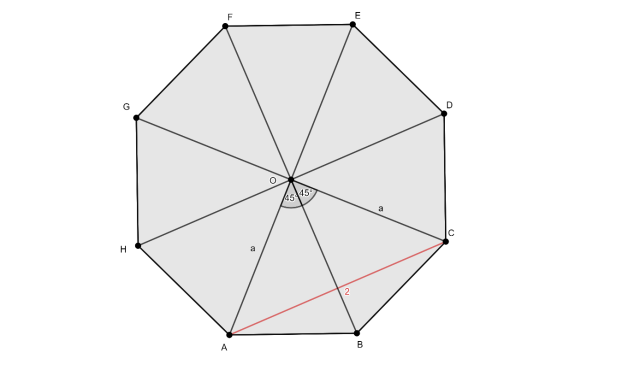 Podziel ośmiokąt na 8 przystających trójkątów równoramiennych, kąt AOB ma miarę 45°, ponieważ 360°: 8 = 45°. Najkrótsza przekątna utworzy trójkąt prostokątny równoramienny OAC, zatem korzystając z własności boków w tym trójkącie obliczyć możesz odcinek a: