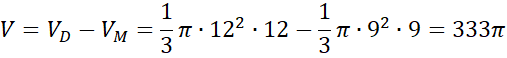 Zauważ, że wysokość i promień podstawy całego i małego stożka są względem siebie w takim samym stosunku, na tej podstawie obliczyć wysokość górnego stożka i objętość stożka ściętego, czyli różnicę dużego stożka i małego.