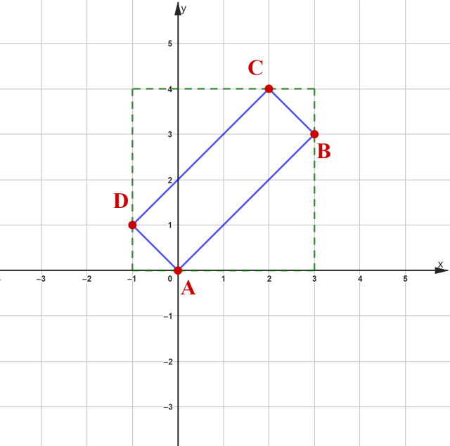Aby obliczyć pole prostokąta, musisz wpisać go w kwadrat o wymiarach 4 x 4. Pole prostokąta jest równe różnicy pola kwadratu i pola powstałych trójkątów.