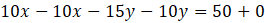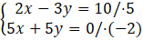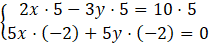 Aby uzyskać przeciwne współczynniki przy zmiennej x w obu równaniach, pierwsze równanie mnożymy obustronnie przez 5, a drugie przez –2, przez co uzyskamy współczynniki przeciwne przy r o wartości 10 i –10.