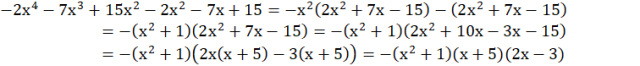 Porównując obie strony równania, widzisz, że współczynniki przy drugich potęgach powinny być równe 13, zatem w kratkę należy wpisać liczbę -2. Po uzupełnieniu pustego pola rozkładasz wielomian na czynniki poprzez wyłączenie wspólnego czynnika przed nawias. Następnie wyłączony czynnik porządkujesz w taki sposób, aby ponownie można go było rozbić wyłączając wspólny czynnik przed nawias.