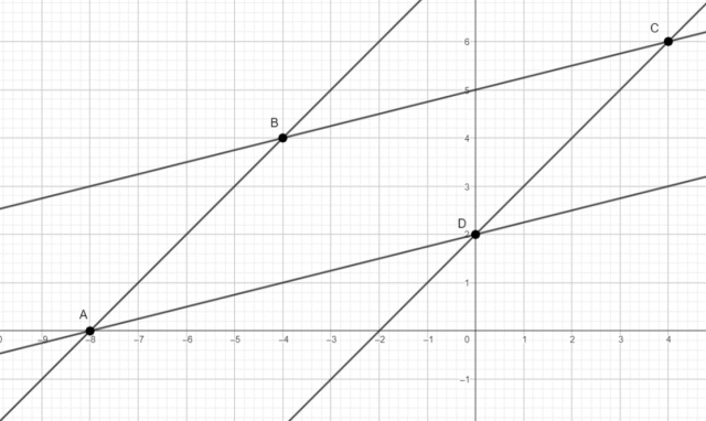 Przekształć równania prostych do postaci kierunkowej. Stwórz ich szkice. Wierzchołki równoległoboku to punkty przecięcia tych prostych. Wyznacz przekątne AC i BD wykorzystując wzór na współczynnik kierunkowy