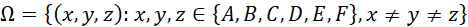 Pojedynczym zdarzeniem będzie pewna trójka elementów (x, y, z), gdzie każdy z nich przyjmuje losową wartość ze zbioru {A, B, C, D, E, F}, a ich wartości nie mogą się powtarzać.