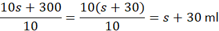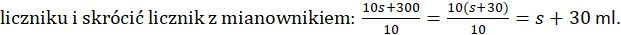 Dolewamy w sumie 300 ml syropu, więc suma objętości syropu będzie wyglądała następująco: 10s + 300. Teraz należy to wyrażenie podzielić przez liczbę szklanek (10), wyciągnąć 10 przed nawias w