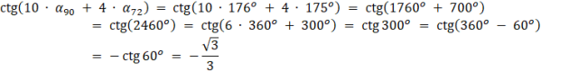 Dla wyznaczenia wartości funkcji tangens kąta 10∙α90+4∙α72powinieneś zapisać ten kąt w postaci sumy pewnej wielokrotności kąta pełnego oraz kąta mniejszego od 360o, a następnie skorzystać z następującego wzoru redukcyjnego: